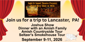 Join us for a trip to Lancaster, Pennsylvania from September 9-11, 2026. Trip includes two night hotel stay, dinner with an Amish Family, Amish countryside tour, and tickets to “JOSHUA” show and more! Cost is $699 per person for double/triple or $849 per person for one person. Please view link below for more information. Limited spots left!